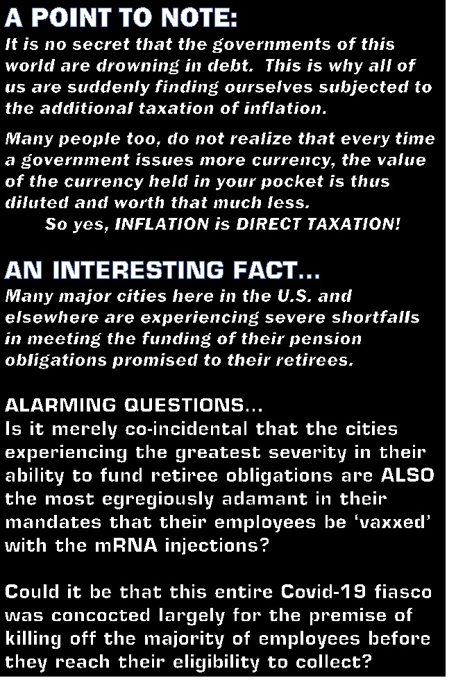 Is it merely co-incidental that the cities experiencing the greatest severity in their ability to fund retiree obligations are ALSO the most egregiously adamant in their mandates that their employees be ‘vaxxed’ with the mRNA injections?