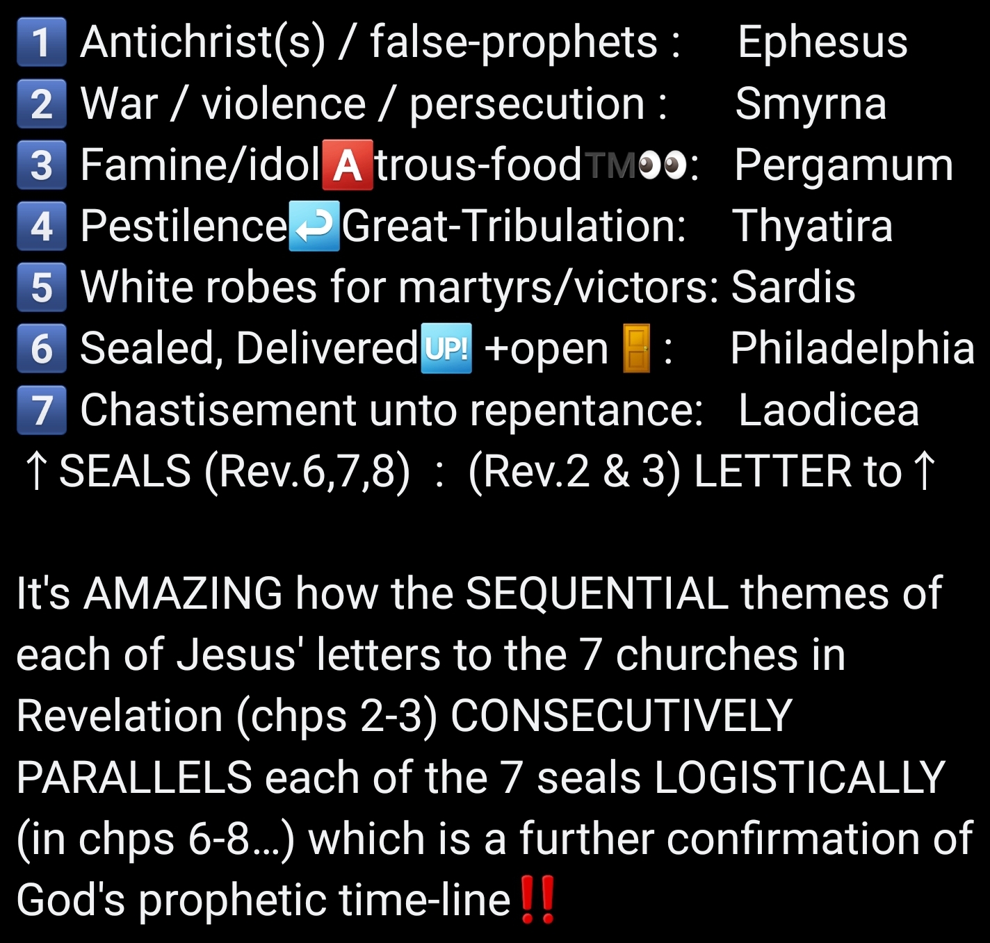 It's AMAZING how the SEQUENTIAL themes of each of Jesus' letters to the 7 congregations in Revelation (chps 2-3) CONSECUTIVELY PARALLELS each of the 7 seals LOGISTICALLY (in chps 6-8…) which is undeniably a further confirmation of God's prophetic END-TIME-LINE‼️