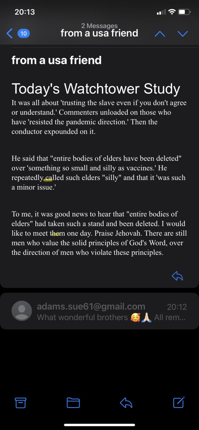 Love love love ❤️ ❤️ this. I kept my mouth SHUT after the Sunday meeting. The Watchtower was very difficult for me . The talk had the same theme. I will wait on Jehovah . My congregation is hush hush ...on who COMPLIED ( as this word has been used alot lately) and or who is ill. We have about 30 on zoom seems like . Some on the phone. So sad.