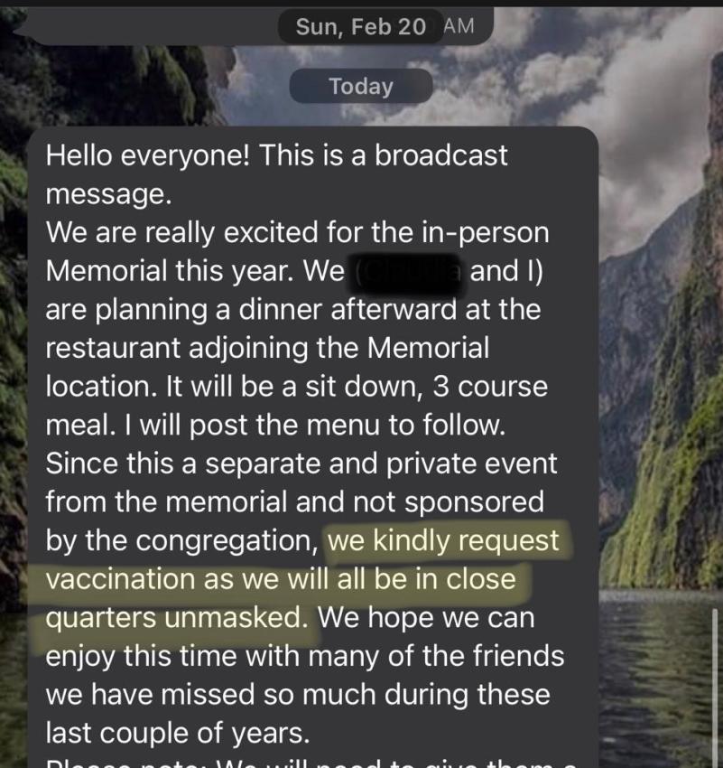 and sharing fellowship with those in the congregation, but only if you're vaccinated. This breaks my heart and these types of behaviors have to stop.